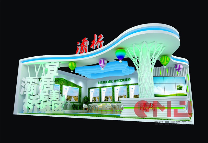 展位整体以白色为主,蓝 色发光灯带点缀,顶部“热气 球”装饰,在视觉效果上更加 清新,体现了灞桥区生态、宜 居的优越区位,利用LED拼接 屏播放灞桥区形象宣传片,打 造集产业、经济、文化为一体 的灞桥生态区。
